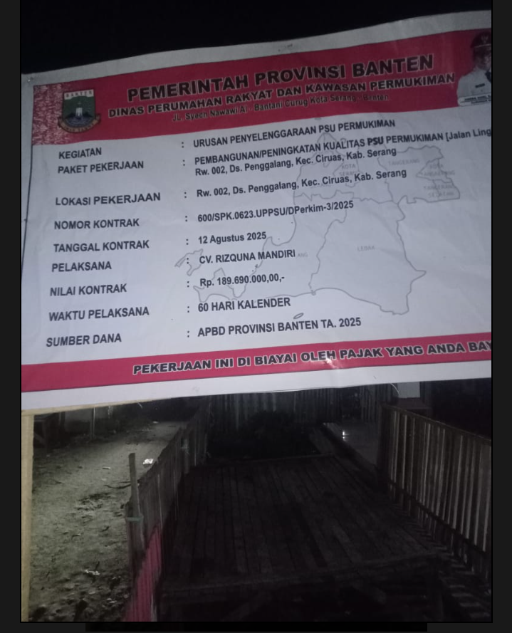 Serang,Rajawaliekspres.com – Proyek Pembangunan Jalan paving block di RT. 002 /008 Desa Penggalang Kecamatan Ciruas Kabupaten Serang, Banten. mendapatkan Apresiasi yang luar biasa dari masyarakat setempat, proyek ini dikerjakan oleh CV. RIZQUNA MANDIRI, melalui Dinas Perumahan Rakyat dan Kawasan Permukiman (Perkim) Provinsi Banten Tahun Anggaran 2025. Pada Minggu (24/08/2025