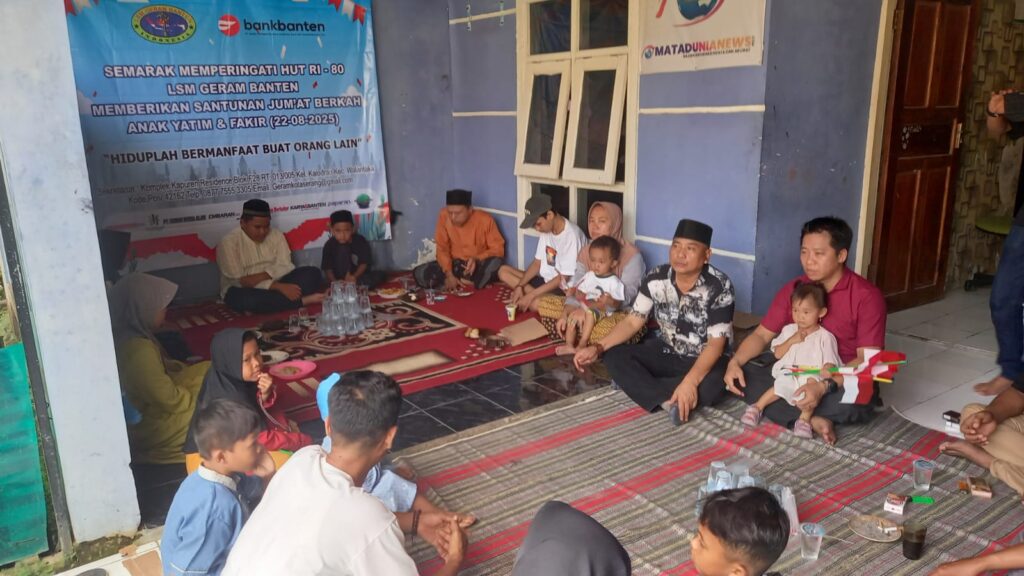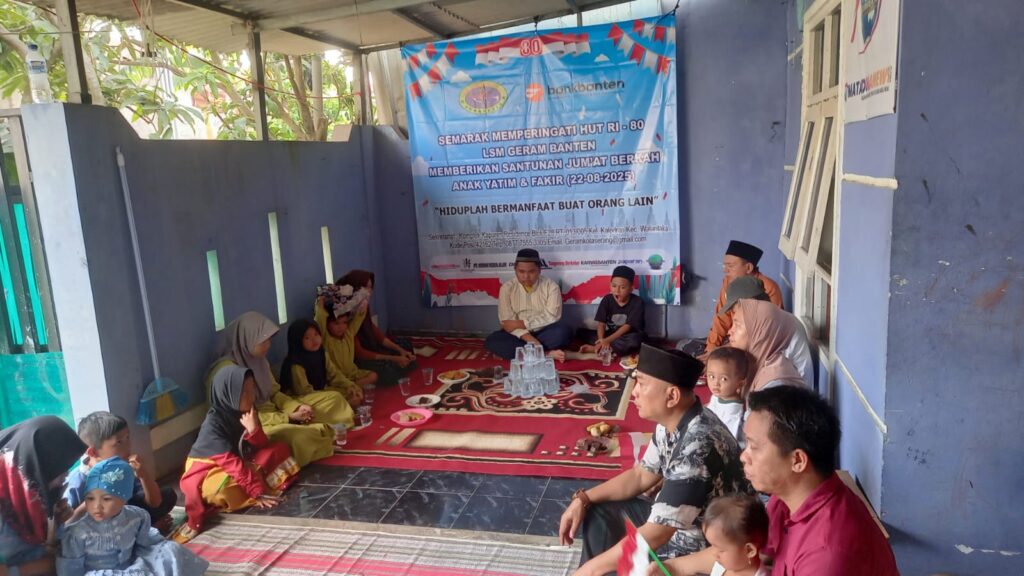 Serang.Rajawaliekspres.Com Dalam rangka memperingati Hari Ulang Tahun (HUT) ke-80 Republik Indonesia tahun 2025, LSM Geram Banten Indonesia DPC Kota Serang menggelar kegiatan sosial bertajuk Jumat Berkah yang dirangkaikan dengan pemberian santunan kepada anak yatim piatu. Acara ini berlangsung di Sekretariat LSM Geram Banten Indonesia pada Jumat (22/8/2025) dengan dukungan dari BPD Bank Banten.