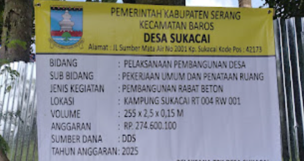 Serang,Rajawaliekspres.com. – Pembangunan Betonisasi jalan menggunakan Dana Desa (DD) di Kampung Sukacai RT 004 RW 001. Desa Sukacai Kecamatan Baros Kabupaten Serang, Banten. Di duga mark up anggaran dan menuai sorotan oleh aktivis. Pada Rabu (27/08/2025).