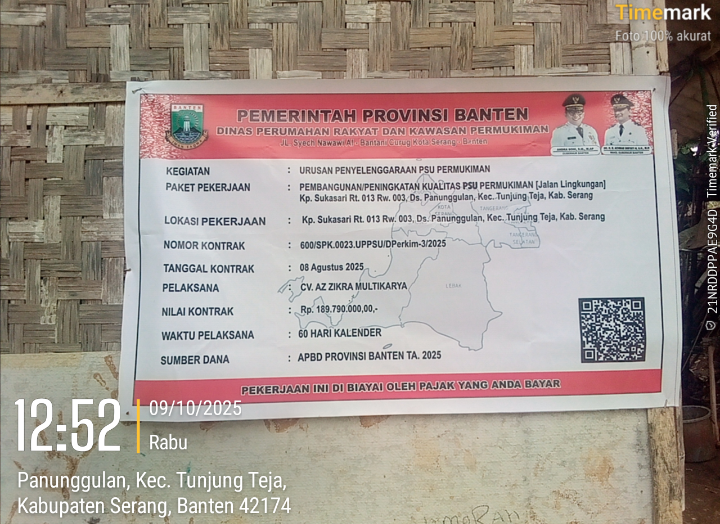 Serang,Rajawaliekspres.com-Proyek Pembangunan Jalan paving block diKp.Sukasari RT. 013 /003 Desa Panunggulan, Kecamatan Tunjungteja, Kabupaten Serang,Provinsi Banten. mendapatkan Apresiasi yang luar biasa dari masyarakat setempat, proyek ini dikerjakan oleh CV.AZZIKRA MULTI KARYA melalui Dinas Perumahan Rakyat dan Kawasan Permukiman (Perkim) Provinsi Banten Tahun Anggaran 2025. Pada hari JUMAT (19/09/2025)