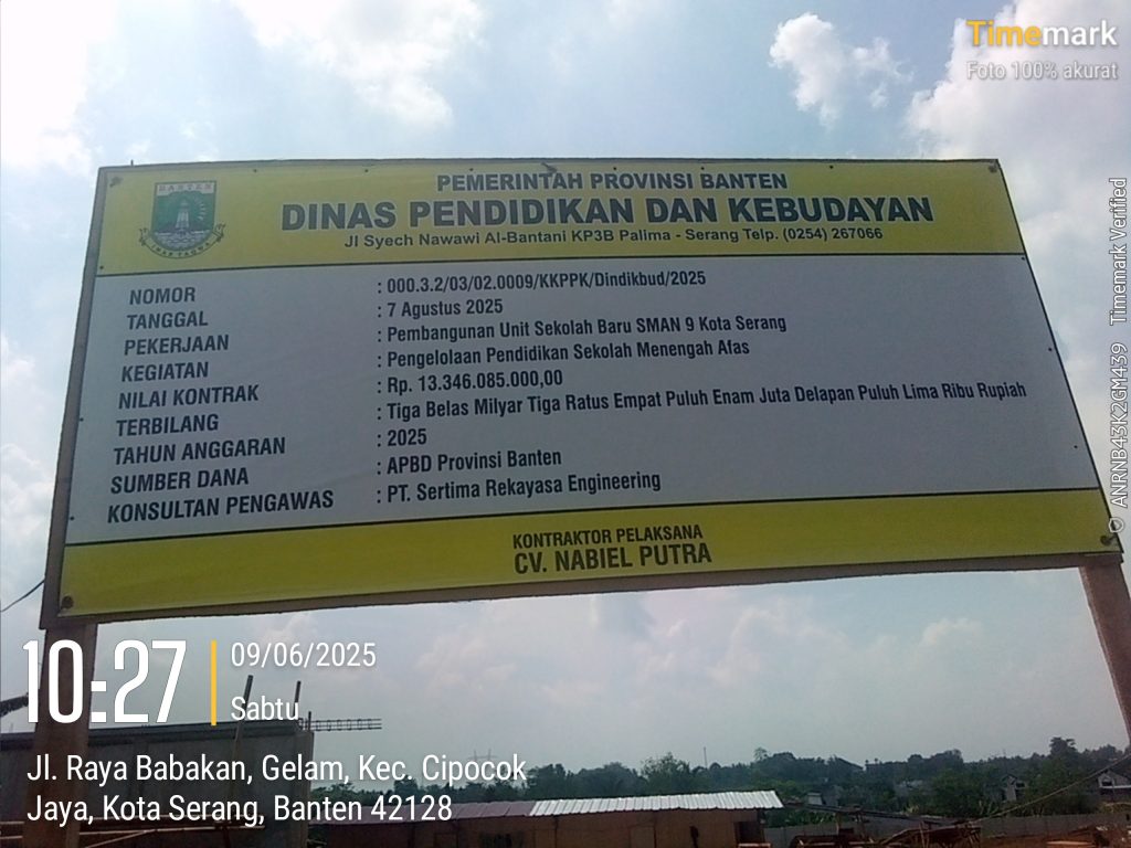 Pembangunan Unit sekolah SMA 9 Kota Serang bersumber dari APBD Provinsi Banten dengan nilai kontrak Rp.13.346.085.000 ( Tiga Belas Milyar Tiga Ratus Empat Puluh Enam Juta Delapan Puluh Lima Ribu Rupiah),Tahun Anggaran 2025,No Kontrak,000,3.2/03.02/009/KKPPK/Dindikbud 2025.Pelaksana ,Nabiel Putra ,Konsultan Pengawas ,Sertima Rekayasa Engeneereeng.Bersumber dari Papan Informasi Publik