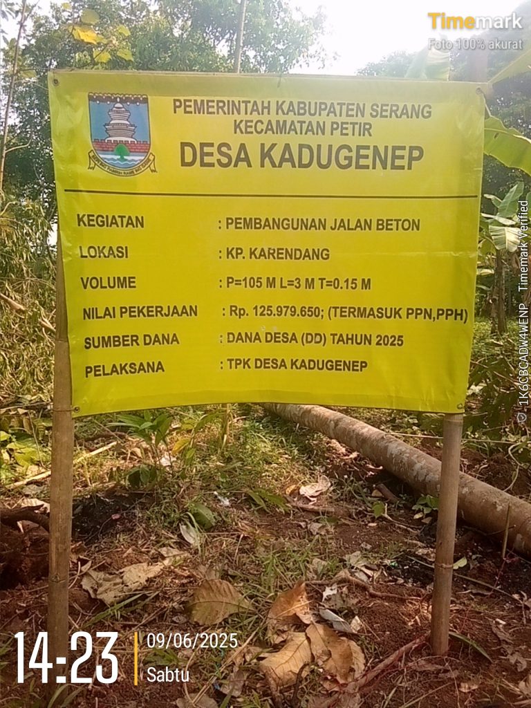 Pembangunan jalan rabat beton lingkungan Kp.Karendang merupakan usulan Musyawarah Desa (Musdes) melalui pemerintah desa yg sekarang sedang dikerjakan dari Sumber dana Dna Desa Tahun Anggaran 2025 dengan Volume Panjangnya 105 M,Lebar 3 M ,Tinggi 0.15 M ,dengan jumlah Anggaran Rp.125.979.650 ( Sudah termasuk PPN )