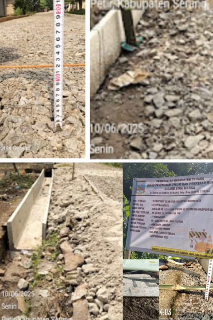 Proyek yang bersumber dari DBH—APBD kabupaten Serang senilai RP. 348.965.339,- tahun anggaran 2025, yang digarap oleh CV. Cipta Alam Raya, ini mengacu pada Kontrak No.620/06-PK.HS.10287542000/SPK/RKN.JL.DS.CRND/KPA-BM/DPUPR/2025. Namun, pelaksanaannya di lapangan diduga jauh dari standar teknis yang ditetapkan dalam kontrak.