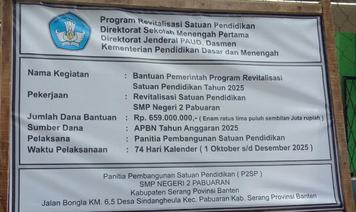 Pembangunan Revitalisasi Satuan Pendidikan SMP Negeri 2 Pabuaran menggunakan anggaran APBN Tahun 2025 sebesar Rp=659.000.000,- di kerjakan selama 79 Hari Kalender ( 1 Oktober s/d Desember 2025 )