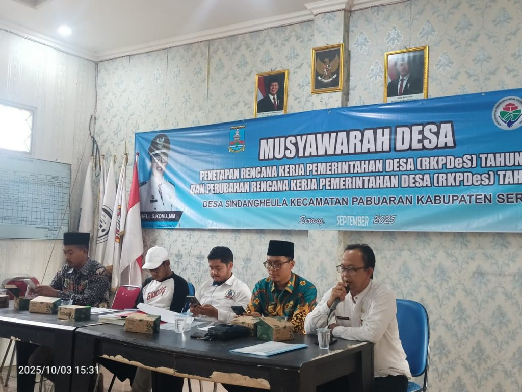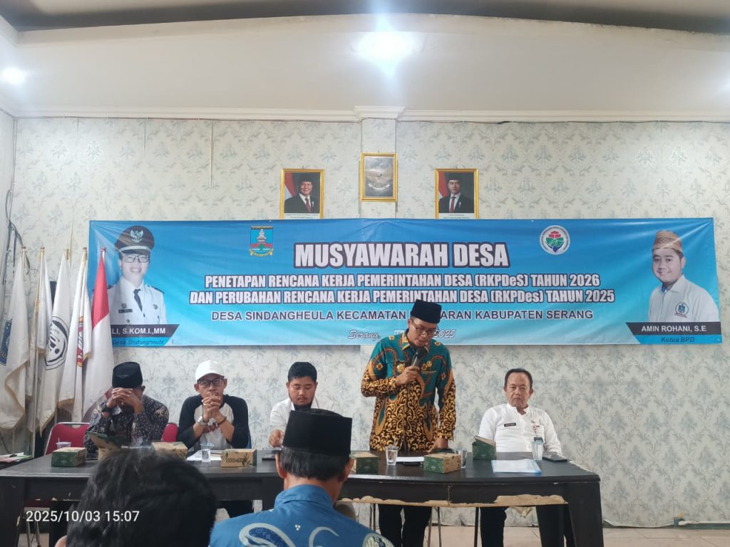 SINDANGHEULA-Rajawaliekspres.Com Pemerintah Desa Sindangheula bersama Badan Permusyawaratan Desa (BPD) menggelar Musyawarah Desa Khusus (Musdesus) dalam rangka penetapan Rencana Kerja Pemerintah Desa (RKPDes) Perubahan Tahun 2025 serta RKPDes Tahun 2026. Kegiatan tersebut berlangsung di Aula Kantor Desa Sindangheula pada Jumat (3/10/2025).