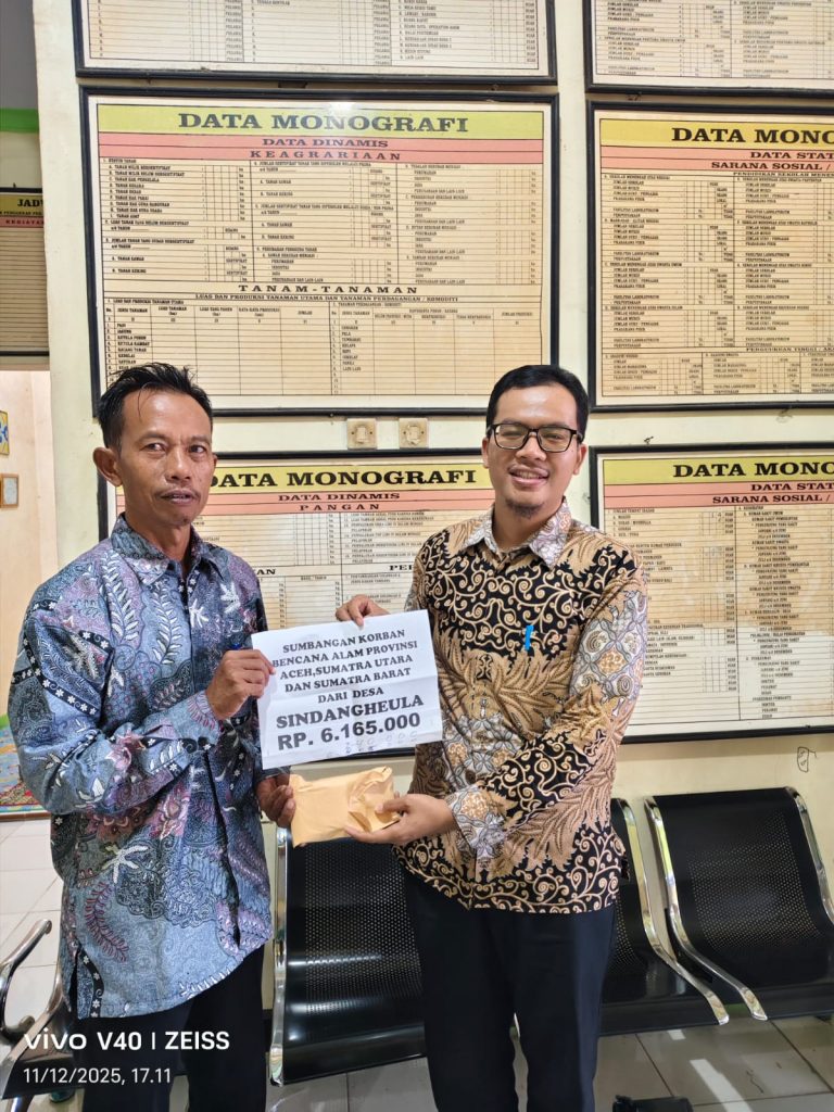 Donasi tersebut berasal dari sumbangan seluruh perangkat desa, anggota BPD, serta warga Sindangheula dari RT 01 hingga RT 19 yang secara gotong royong menunjukkan kepedulian terhadap sesama.