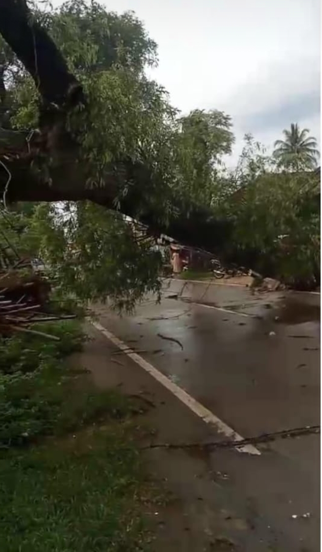 Serang|rajawaliekspres.Com Pohon asam berukuran besar tumbang dan menutup total Jalan Raya Petir–Ciruas di Kelurahan Nyapah, Kecamatan Walantaka, Kota Serang, Selasa dini hari, 04.00 WIB. Pohon yang diperkirakan berusia ratusan tahun itu roboh akibat batang rapuh yang diperparah hujan deras disertai angin kencang.