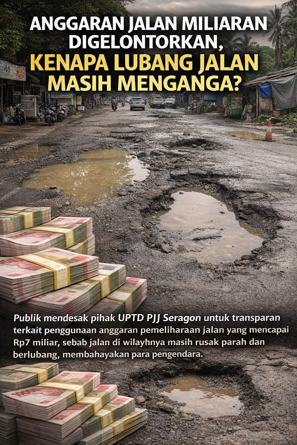 Serang|Rajawaliekspres.Com Kondisi sejumlah ruas jalan yang berada di bawah kewenangan UPTD PJJ Seragon, Dinas PUPR Provinsi Banten menuai sorotan tajam. Pasalnya, meskipun anggaran pemeliharaan jalan mencapai miliaran rupiah pada tahun 2025, di lapangan masih ditemukan banyak jalan rusak dan berlubang yang dinilai membahayakan pengguna jalan.