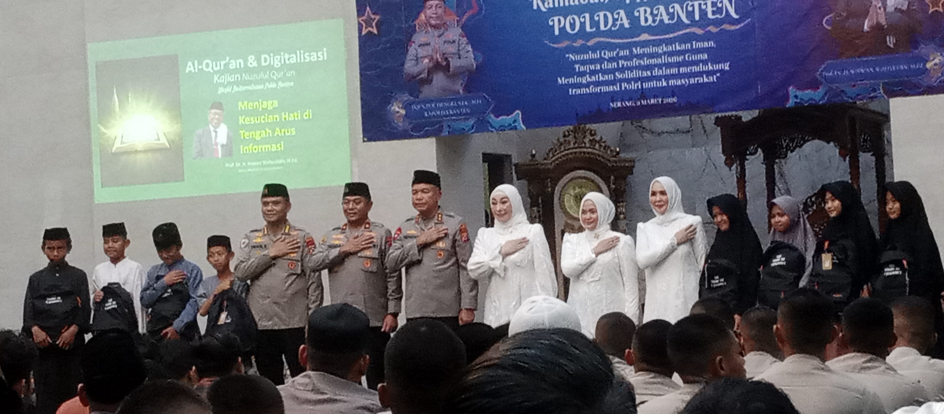 peringatan Nuzulul Quran bertema meningkatkan iman takwa dan menjalin silaturahmi serta profeisonalisme guna meningkatkan.solidaritas dalam mendukung tranformasi polri untuk masyarakat kegiatan berlangsung di masjid Arahman Polda Banten jalan syekh moh nawai